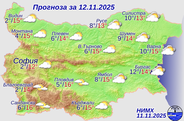 През днешния ден ще преобладава слънчево време, с разкъсана висока облачност. Преди обяд над Източна България облачността ще е все още значителна, но ще се разкъсва и ще намалява. Ще духа слаб, в Дунавската равнина до умерен вятър от запад-северозапад. Минималните температури ще бъдат между 4° и 9°, по-ниски в котловините, в София – около 2°. Максималните температури ще бъдат между 12° и 17°, в София – около 12°. Това съобщават от Национален институт по метеорология и хидрология (НИМХ).