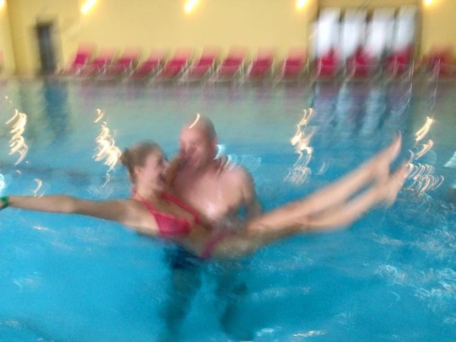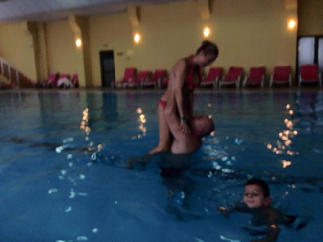 Красивата блондинка прикачи и снимка, на която Тишо я е вдигнал във въздуха в басейна, докато синът им Патрик подобрява уменията си в плуването.