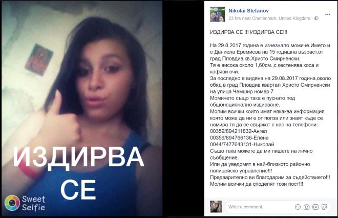 В социалните мрежи се разпространи призив за помощ във връзка с изчезването на девойката: