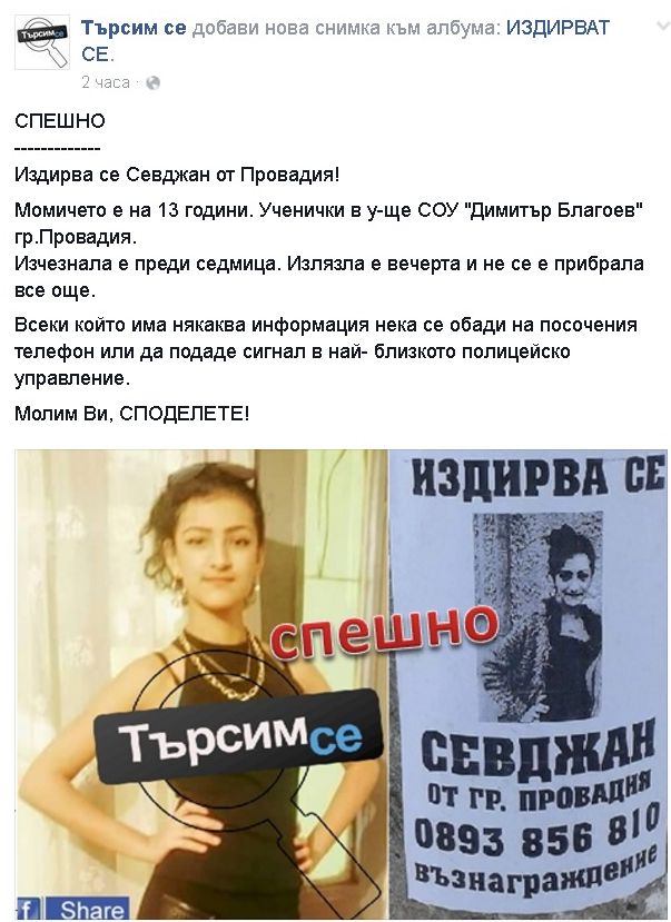 „Издирва се Севджан от Провадия! Момичето е на 13 години. Ученички в у-ще СОУ „Димитър Благоев”-гр. Провадия.