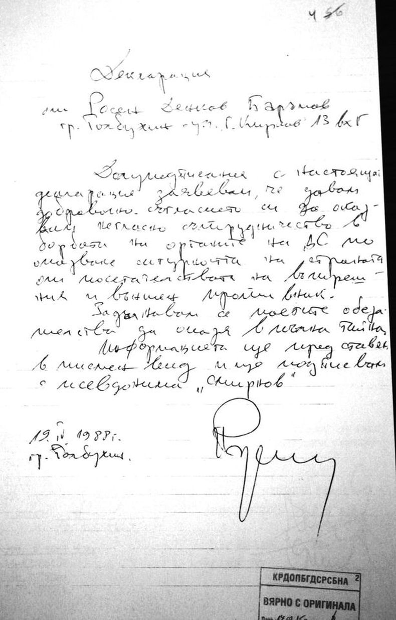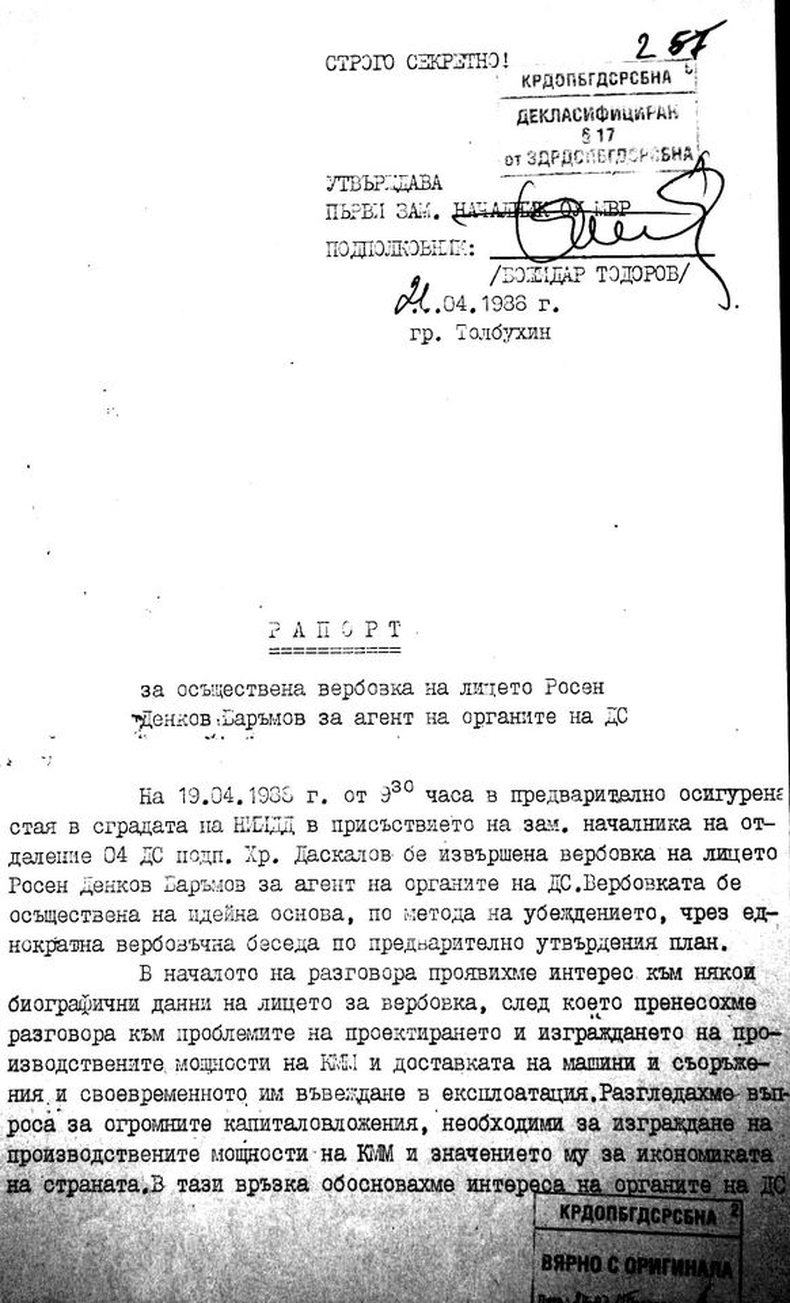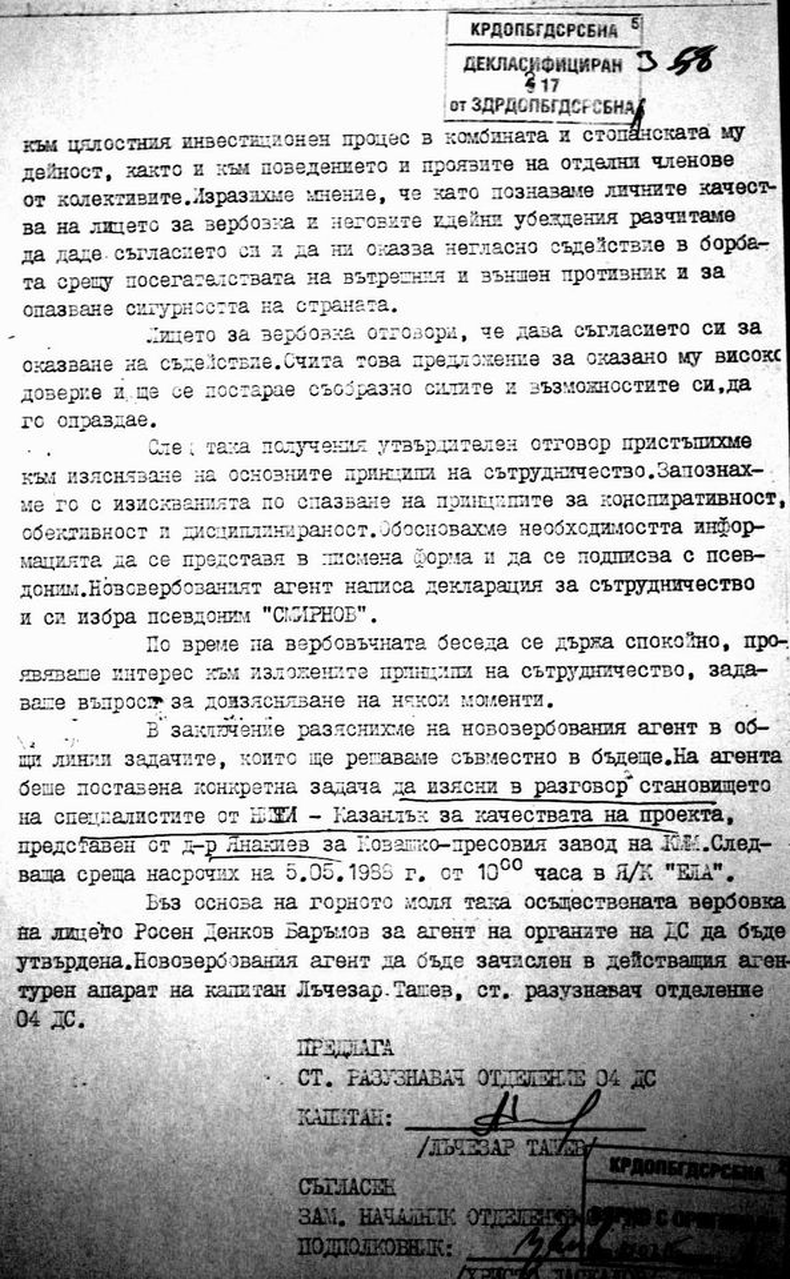 На 19.04.1988 г., от 9,30 часа, в предварително осигурена стая в сградата на НИИДД, в присъствието на зам. началника на отделение 04 –ДС подп. Хр. Даскалов, бе извършена вербовка на лицето Росен Денков Баръмов за агент на органите на ДС. Вербовката бе осъществена на идейна основа, по метода на убеждението, чрез еднократна вербовъчна беседа по предварително утвърден план...Нововербованият агент подписа декларация за сътрудничество и си избра псевдоним „Смирнов“...В заключение разяснихме на нововербования агент в общи линии задачите, които ще решаваме съвместно в бъдеще. На агента беше поставена конкретна задача да изясни в разговор становището на специалистите от НИТИ-Казанлък за качествата на проекта, представен от д-р Янакиев...“