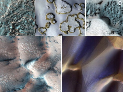 Ниската температура е превърнала въглеродният двуокис от атмосферата на планетата в ледени частици, които образуват причудливи форми. Те много наподобяват тези, които се наблюдават на повърхността на Земята зимно време. Общият обем на леда на повърхностния слой на Марс се оценява на 5 милиона кубични километра. При нагряване до състояние на течност, това количество е достатъчно, за да покрие цялата планета със слой вода с дебелина 35 метра.