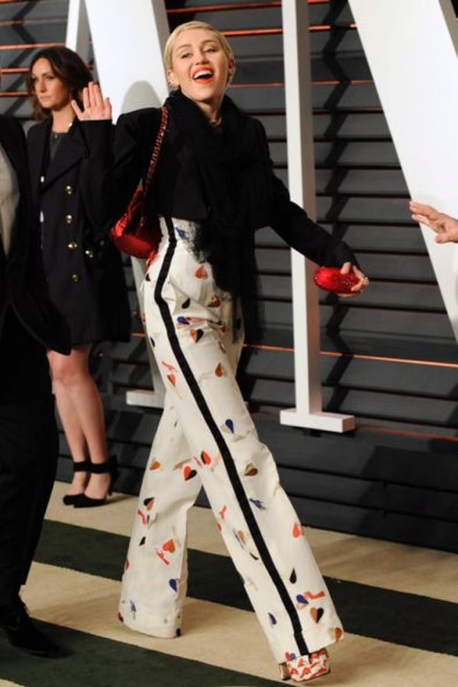 Майли Сайръс втрещи всички с визията си. Певицата определено може да се пребори за някоя "Златна малинка". Скандалната екс актриса на "Дисни" се появи с бял панталон, обкичен с шарени сърчица и кичозни обувки. Истински моден гаф!