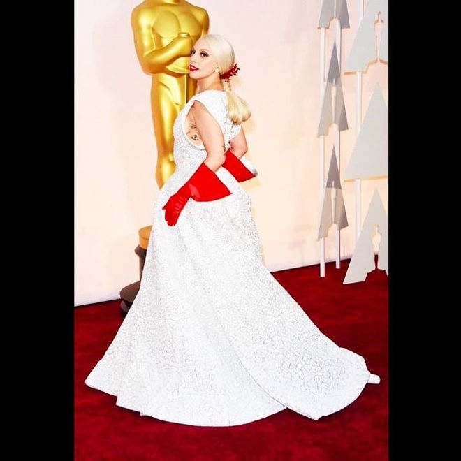 Лейди Гага остана вярна на провокативния си стил на обличане. Прясно сгодената певица се появи на церемонията в прекрасна бяла рокля, но с нетрадиционен аксесоар - червени гумени ръкавици.