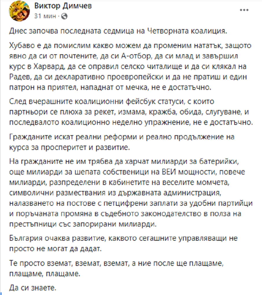 На гражданите не им трябва да харчат милиарди за батерийки, още милиарди за шепата собственици на ВЕИ мощности, повече милиарди, разпределени в кабинетите на веселите момчета, символични размествания из държавната администрация, налазването на постове с петцифрени заплати за удобни партийци и поръчаната промяна в съдебното законодателство в полза на престъпници със запорирани милиарди.