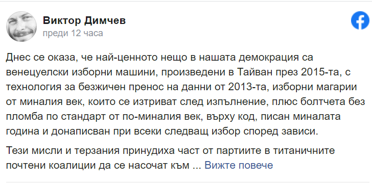 Днес се оказа, че най-ценното нещо в нашата демокрация са венецуелски изборни машини, произведени в Тайван през 2015-та, с технология за безжичен пренос на данни от 2013-та, изборни магарии от миналия век, които се изтриват след изпълнение, плюс болтчета без пломба по стандарт от по-миналия век, върху код, писан миналата година и донаписван при всеки следващ избор според зависи.