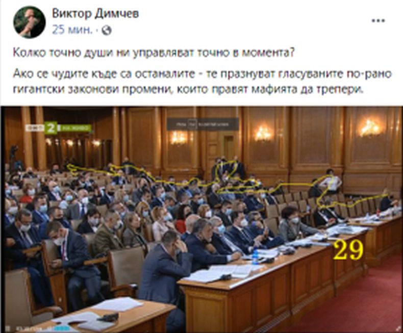 "Ако се чудите къде са останалите - те празнуват гласуваните по-рано гигантски законови промени, които правят мафията да трепери", пише Димчев.