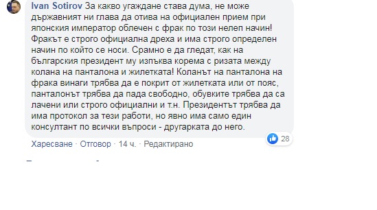 А на коментар на приятелите му от социалната мрежа, че няма угодия, ексдепутатът обяснява: "За какво угаждане става дума, не може държавният ни глава да отива на официален прием при японския император облечен с фрак по този нелеп начин! Фракът е строго официална дреха и има строго определен начин по който се носи. Срамно е да гледат, как на българския президент му изпъква корема с ризата между колана на панталона и жилетката! Коланът на панталона на фрака винаги трябва да е покрит от жилетката или от пояс, панталонът трябва да пада свободно, обувките трябва да са лачени или строго официални и т.н. Президентът трябва да има протокол за тези работи, но явно има само един консултант по всички въпроси - другарката до него."