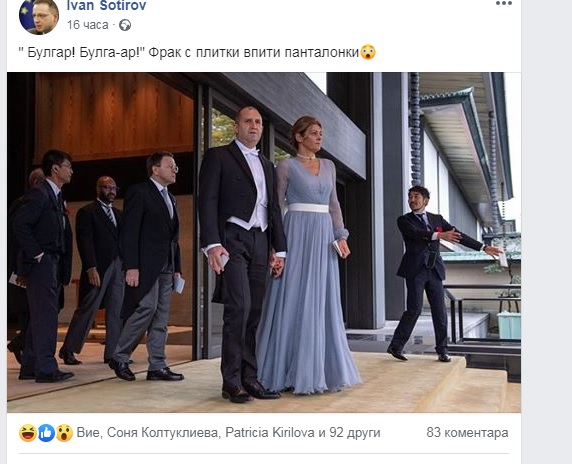 Официалният тренд на президента Румен Радев по време на интронизацията на новия император на Япония коментира днес бившият депутат от СДС Иван Сотиров. "Булгар! Булга-ар!" Фрак с плитки впити панталонки", иронизира облеклото Сотиров на страницата си във Фейсбук и допълва "Деси така си го харесва, по сеЛкси е".