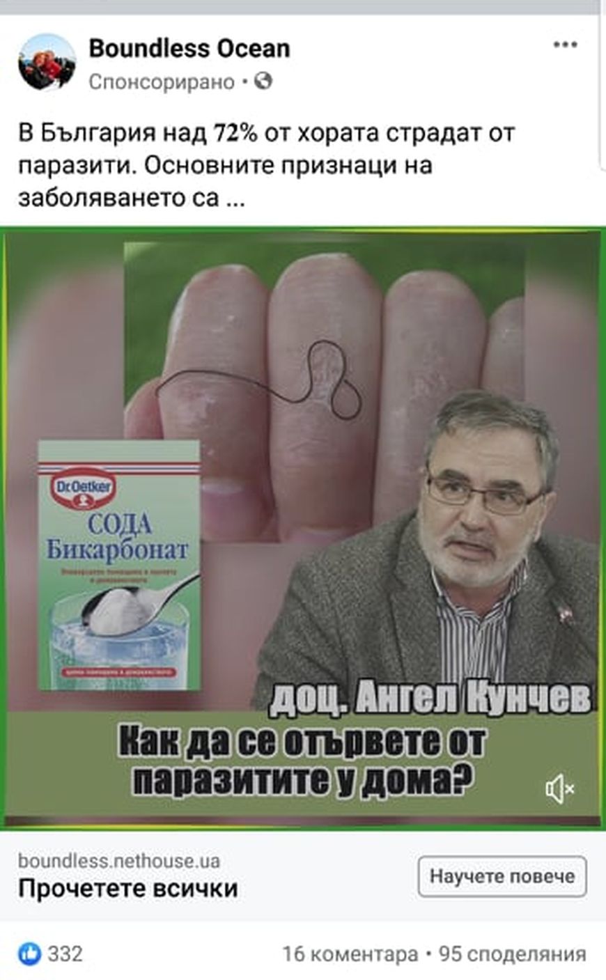 Без знанието на медика, ликът му се лепи върху стикер, който широко прокламира как над 72 процента от българите, страдащи от паразити, могат лесно да се отърват от тях чрез рекламирания от платформите препарат на основата на сода за хляб, сода бикарбонат.