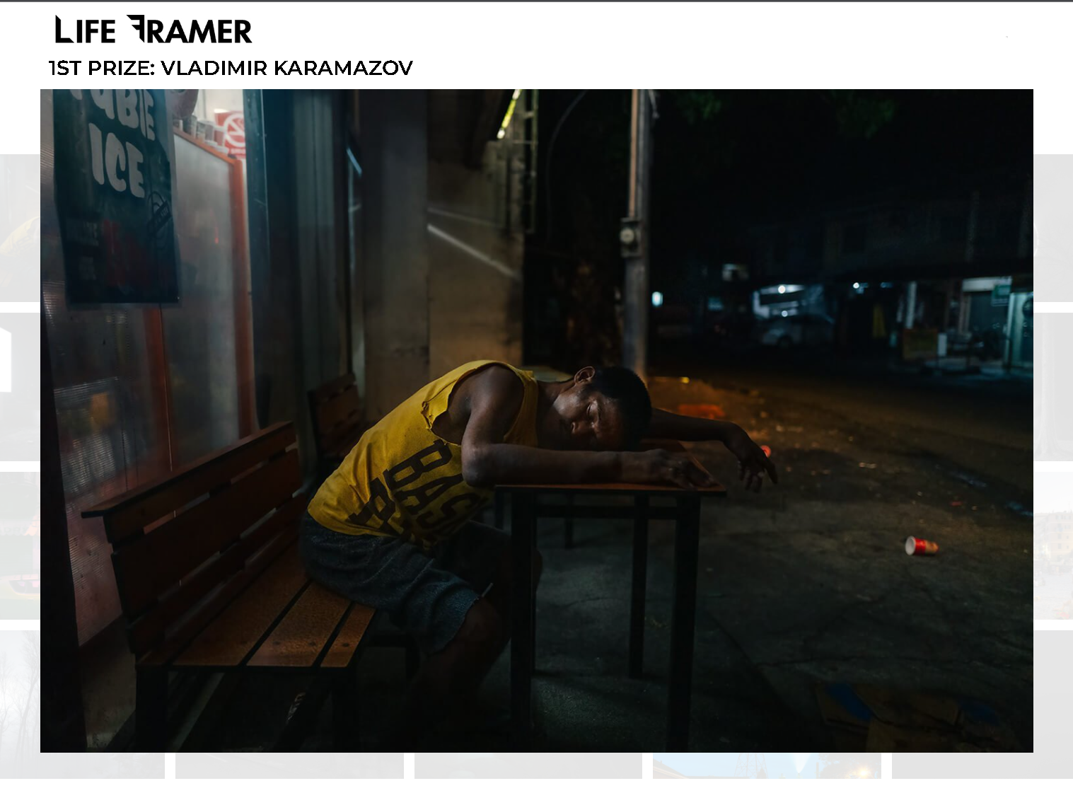 Актьорът фотограф разказва историята на премираната снимка със спящ тъмнокож мъж. "Този кадър направих след едно 15-часово пътуване във Филипините. Спряхме през нощта до едно магазинче за почивка и видях този човек, който спеше. Светлината и атмосферата около него бяха страхотни за фотография", обяснява той. И допълва: "Благодаря на Kevin Cooley, който избра моята снимка в този конкурс. Благодаря и за паричната награда! В Life Framer журират най-добрите в света".
