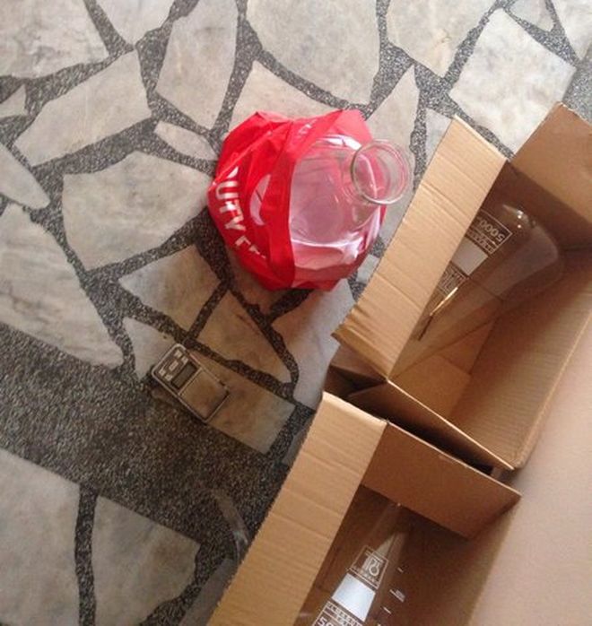 В паркиран автомобил са намерени две пластмасови туби с вместимост 30 литра, съдържащи безцветна течност с мирис на "ацетон"