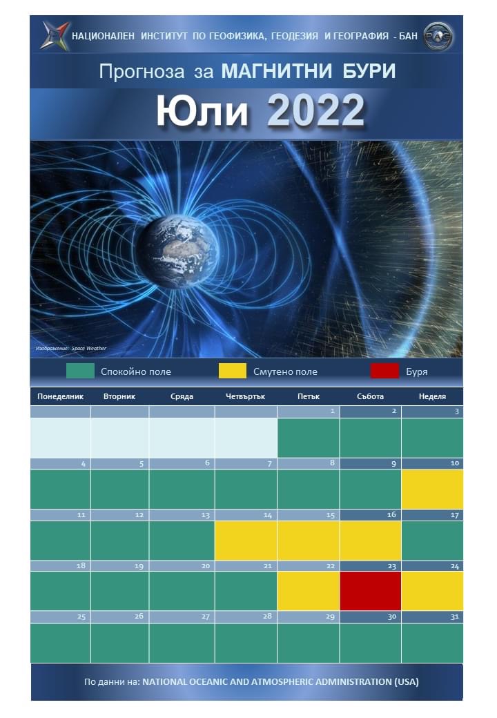 Дългосрочните прогнози допускат смущения на геомагнитното поле около 10 юли, около средата на месеца и около самия край на периода.