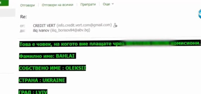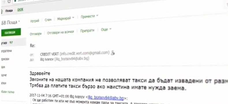 Илия Борисов от чирпанското село Свобода кандидатства, за да погаси стари задължения. След два дни получава имейл, че е одобрен. Само срещу лична карта, без да доказва доходи. Той очаква да му преведат обещания кредит от 30 000 лв. Преди това обаче трябва да плати такса, с която трябва да се платят трансферите. Става въпрос за 724 лв. Получава второ съобщение, че трябва да плати още веднъж тази сума, за да получи трансфера си. Следва още съобщения за още два такива превода.