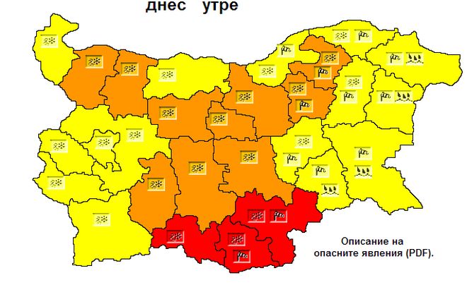 В 10 области на Централна и Северна България е обявен оранжев код за силни снеговалежи и виелици. Кодът е в сила за областите Монтанска, Врачанска, Ловешка, Габровска, Великотърновска, Търговищка, Разградска, Пазарджишка, Пловдивска и Старозагорска. В Монтана и Видин количествата валежи ще са около до 10-15 л/кв.м, но в южната част на областите - 30-50 л/кв.м. В Ловеч и Габрово очакваните количества са до 50-60 л/кв.м.