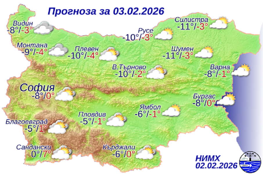Сутринта на места в равнините и низините ще се образува мъгла. Ще бъде студено с минимални температури между минус 10° и минус 5°, на места в Северна България и високите полета на Западна – до минус 14°, в крайните югозападни части от страната – до 0°, за София – около минус 8°.