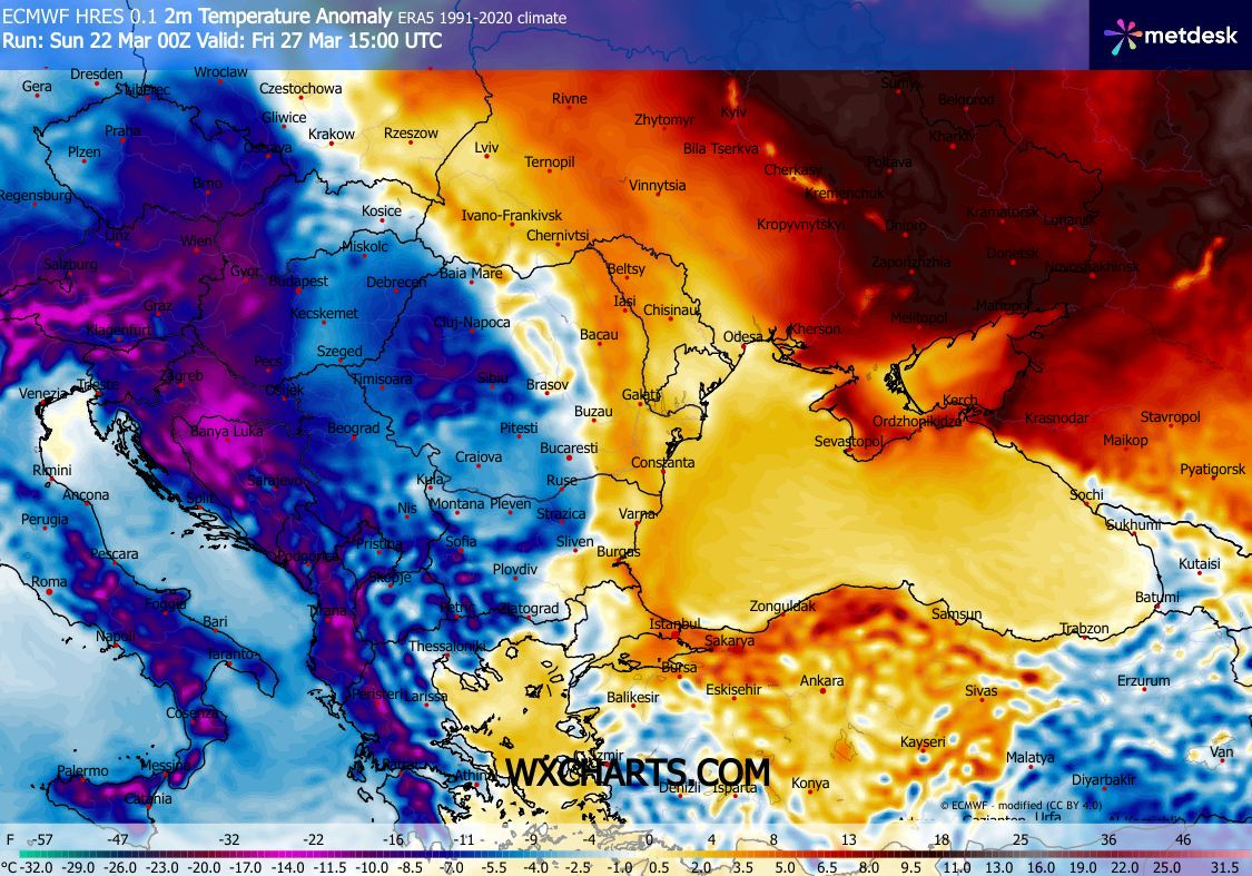 В по-широк мащаб застудяването ще обхване голяма част от Балканите и Централна Европа, като причината е нахлуване на студена въздушна маса. След 27 март максималните температури в страната ще бъдат между 8°C и 10°C, а в планинските райони ще паднат под -2°C.