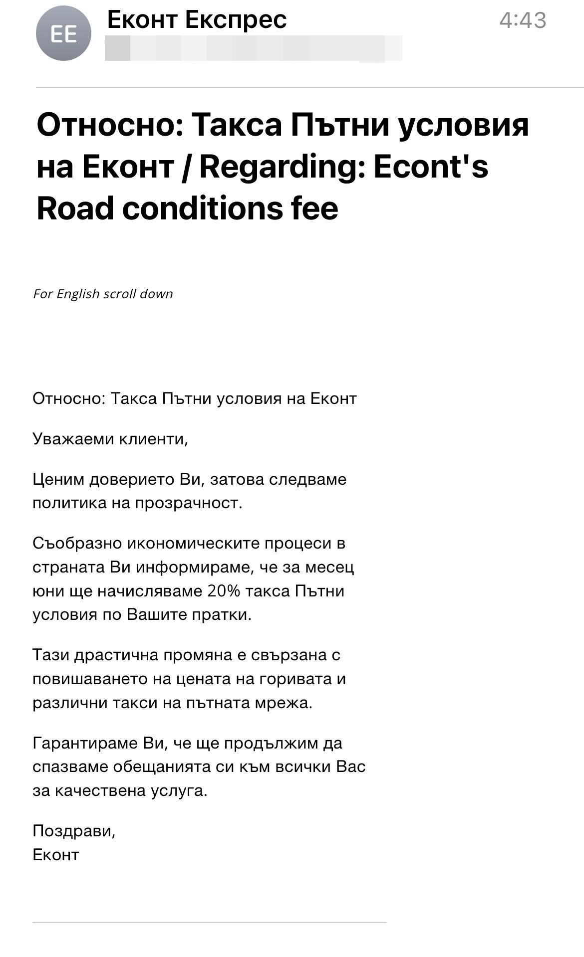 Рано тази сутрин клиентите на най-голямата фирма за пратки в България - "Еконт", получиха имейли, че от утре, 1 юни, таксата "Пътни условия" скача на 20%.