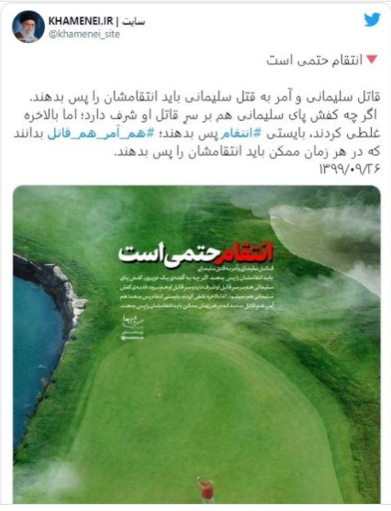 В последния негов туит на фарси думата „отмъщение“ е в червено, като текстът продължава: „Убиецът на Солеймани и този, който го нареди, ще трябва да си платят“.