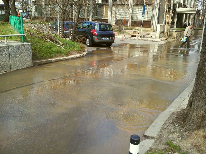 Кални води потекоха от извиращия като водопад гейзер, като хората в квартала се възмутиха, че вместо да оправят нещата, служителите на частната фирма създадоха истинска баня до театър "София".