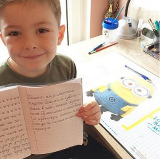 Гордата майка публикува снимка в социалната мрежа на сина си, на която той позира с тетрадка в ръка.