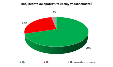 Подкрепата за различните форми на протест срещу правителството е сериозна – мнозинство от 70% отговаря с „да“ на директен въпрос. 27% са на противоположното мнение, а останалите не могат да преценят.