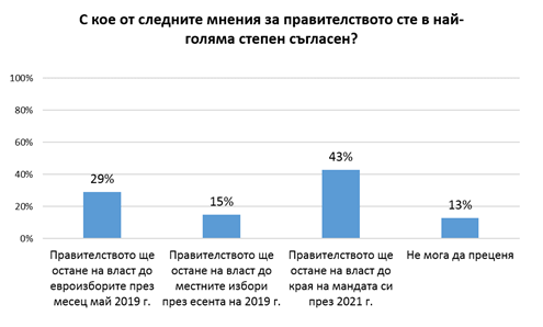 На този фон, практически еднакви изглеждат дяловете на онези, които очакват предсрочно напускане на кабинета и онези, които очакват пълен мандат. 43% от анкетираните споделят мнението, че правителството ще остане на власт до края на мандата си през 2021 г., но 29% възприемат опцията „до евроизборите“, а 15% - до местните избори през 2019 г. Така общо 44% очакват преждевременен край на правителството. Останалите се колебаят.