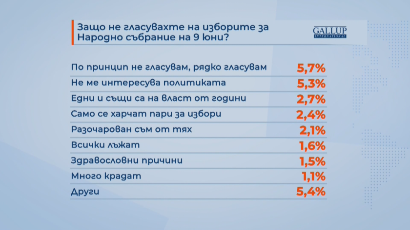 Близо 27% посочват, че на последните избори не са гласували нито за политици, нито за партия, просто защото нямат доверие в тях. На второ място се нареждат хората, които не могат да дадат отговор защо не са отишли до урните.