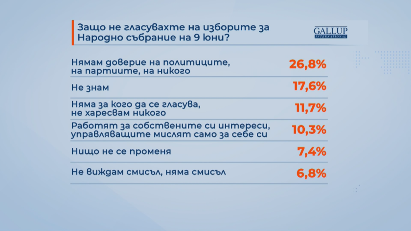 Недоверието в политиците е основната причина сънародниците ни да не излязат да гласуват на последните избори. Това показва представително изследване на "Галъп интернешънъл болкан", направено за БНТ.