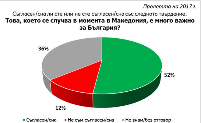 Мнозинство от 52% възприема, че случващото се в Македония е много важно за България. Малко над една трета не са дали еднозначен отговор, а само една десета смятат, че това което се случва в югозападната ни съседка не е важно за нас. Запознатостта не е висока, но усещането за важност, съответно тревога, преобладава и тази тенденция ще се задълбочи след последните събития.