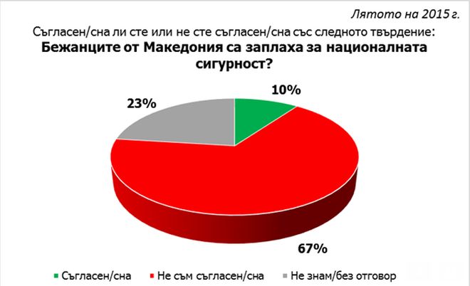 Доказателство за последното беше експерименталният въпрос, който зададохме през 2015 г., в тогавашния пик на политическата криза в съседната страна. Тогава беше актуална темата за евентуални бежанци от Македония, Украйна и т.н. Данните ясно показаха, че у нас хората от Македония не се възприемат като проблем. 67% отхвърлиха твърдението, че бежанци от Македония са проблем за заплаха за националната ни сигурност.