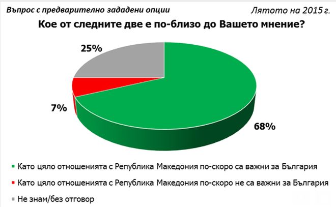 „Галъп интернешънъл“ наскоро провери и общото отношение на българските граждани към други страни. Македония се подреди в първата десетка на страните, които усещаме като близки - сред 42 държави. Когато бяха попитани кои страни чувстват най-далечни, българите отново показаха, че Македония не е сред тях. В ежемесечните изследвания на „Галъп интернешънъл“ обаче недоверието на българските граждани към съвременната република Македония е видимо – вероятно заради десетилетните политики на съзнателно раздалечаване на хората от двете страни на границата. Това означава, че у нас отношението към политическия елит на югозападната ни съседка е закономерно заредено по-скоро с недоверие, но отношението към самите хора на Македония и към страната като цяло е като към близки.