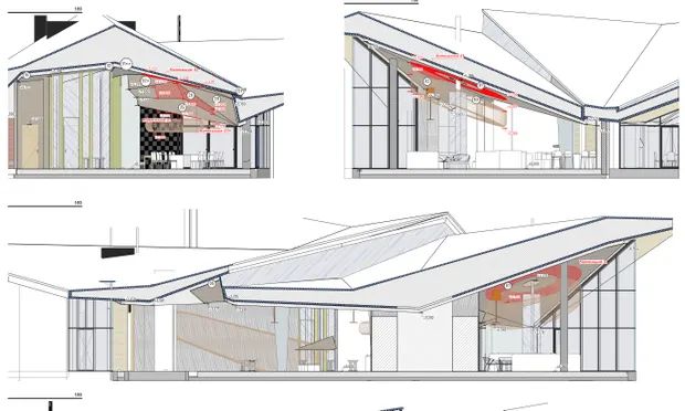Стъклена преграда разделя голямата трапезария от професионална кухня, оборудвана със скари, с тандур – вид глинена пещ, тепаняки – грил в японски стил, стая за опушване на месо.