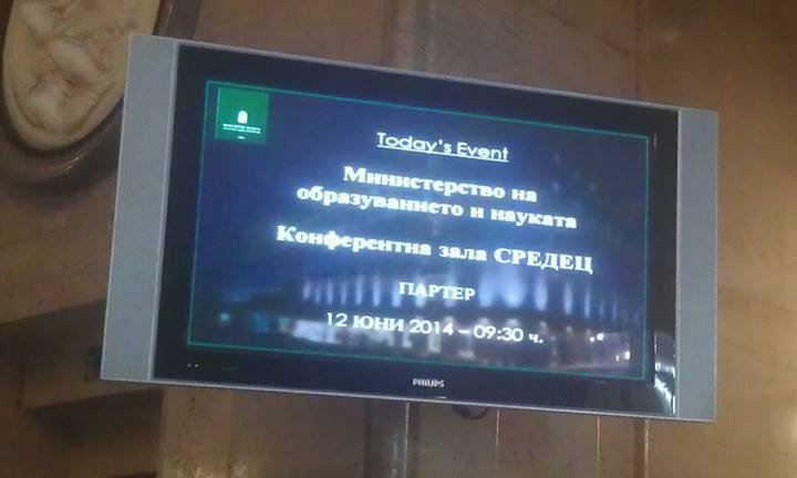 Гаф съпроводи откриването на конференция, организирана от Министерството на образованието и науката (МОН). Участниците във форума бяха упътвани към залата, в която се провежда събитието, от монитор с надпис: "Министерство на образУванието и науката. Конферентна зала Средец".
