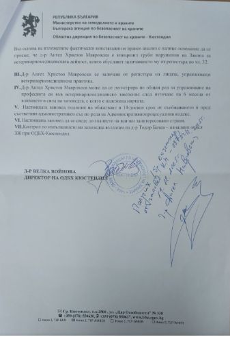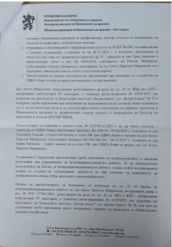 Заличаването е извършено със заповед на директора на Областната дирекция по безопасност на храните - Кюстендил от 14 ноември 2025 г., издадена на основание Закона за ветеринарномедицинската дейност след проверки на Областната дирекция по безопасност на храните - Ловеч.
