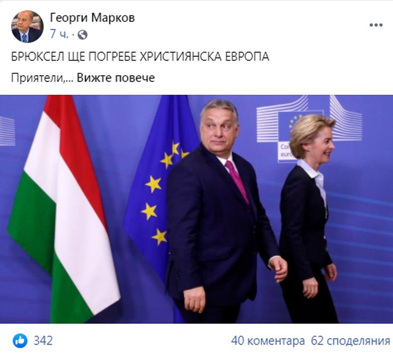 "Днес във велика Франция обезглавяват учители, полицаи и свещеници; мигрантите поругават и малолетни - Вие мълчите! Страшни европейски ценности предлагате - миграция на ножа и гей бракове. Погребвате християнска Европа. Унгария не ви е колония, не е имала, няма и няма да има шеф. Унгария не може да бъде поробена с цвета на дъгата. Брюксел ще погребе християнска Европа"." Това написа гневно на страницата си във "Фейсбук" бившият депутат Георги Марков. Апелът му е към лидерите на Евросъюза и председателката на Еврокомисията Урсула фон дер Лайен, която нападна унгарския премчиер Виктор Орбан заради закона закон, забраняващ образователни програми с дискусии за хората с различна сексуална ориентация.