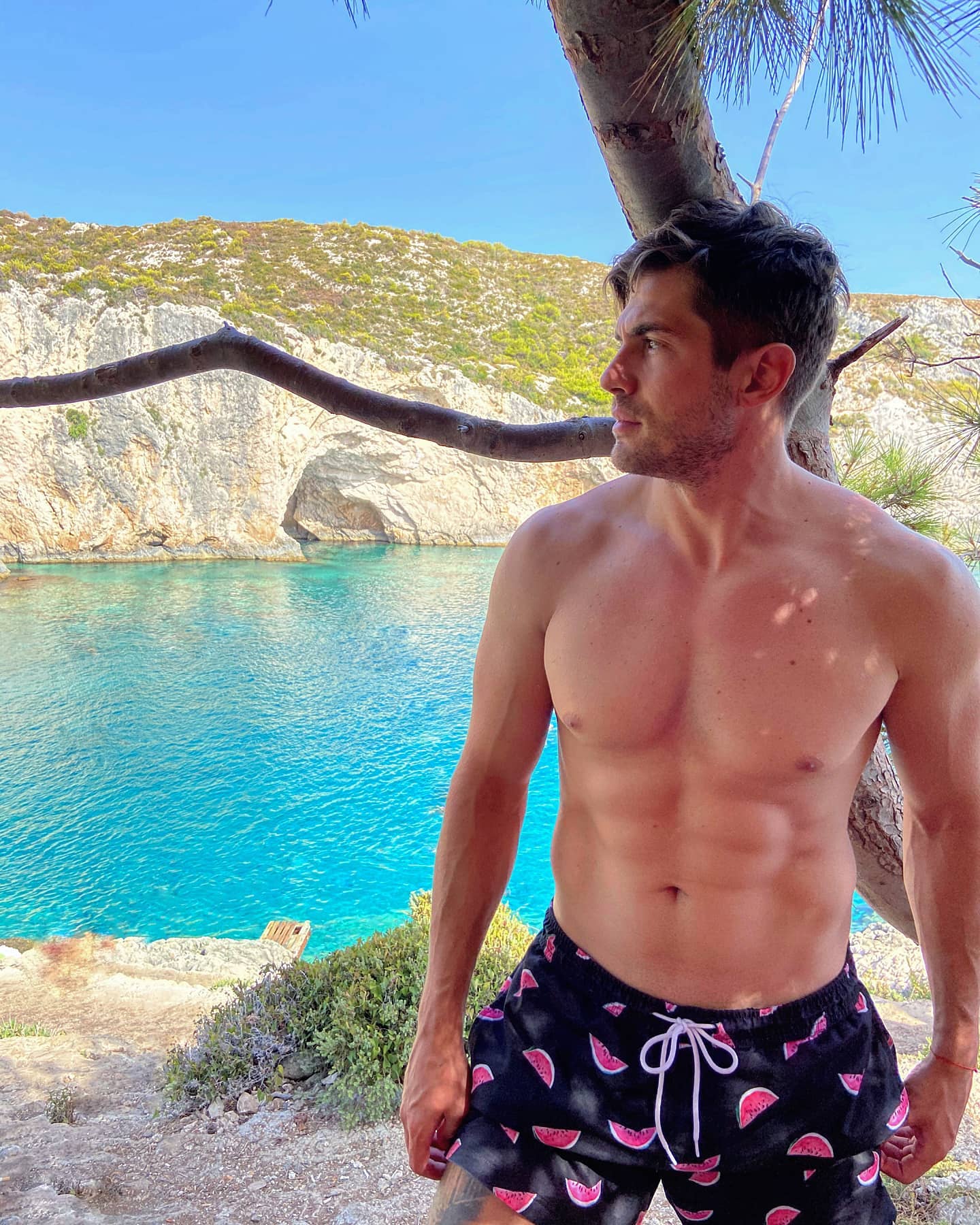 Иво се е спрял на маркови плувни шорти, на които са изобразени резенчета дини.