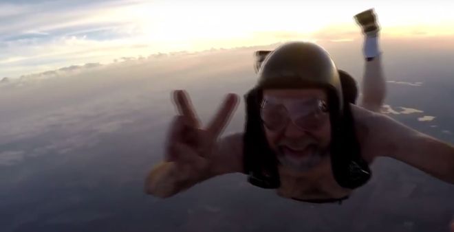 "Целта ми е да стана най-възрастния парашутист в света. Ще скачам, докато имам сили, но винаги ще бъда без дрехи", казва Джав Доусън.