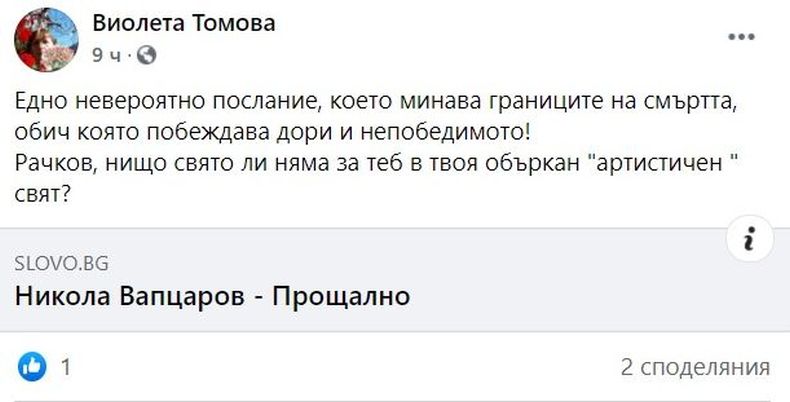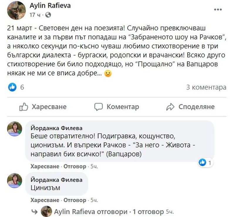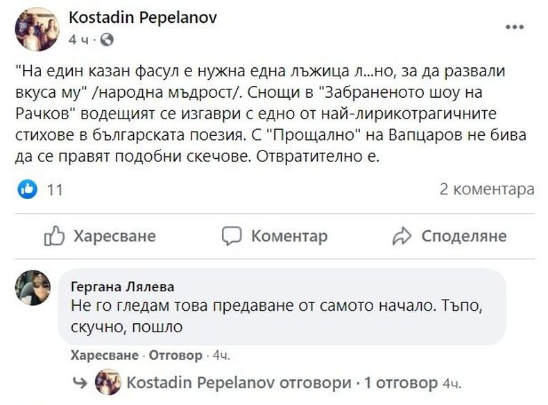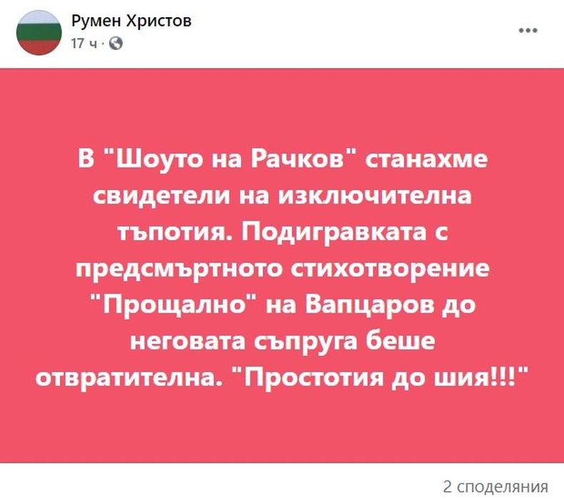 "И за да ви демонстрирам прелестите на българските диалекти, искам да ви покажа как би звучало "Прощално" на големия поет Никола Вапцаров в различни краища на България", включи се Рачков, рецитирайки емблематичната творба с бургаски, родопски и врачански диалект. Това обаче по-скоро вбеси хората, застанали пред малкия екран, както става ясно и от рецензиите (виж по текста - б.р.) в социалните мрежи, забеляза "Флагман".