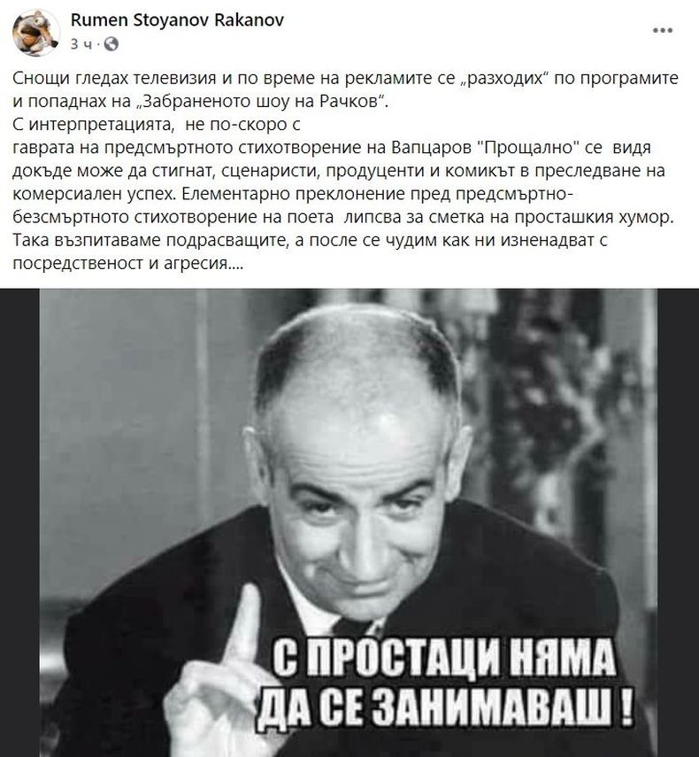 Възмутени зрители погнаха Димитър Рачков и екипа на забраненото му шоу след заигравката му с едно от най-красивите любовни стихотворения - "Прощално" на Никола Вапцаров. Това е основната дискусия, която буквално взриви социалните мрежи след третото издание на "Забраненото шоу на Рачков".