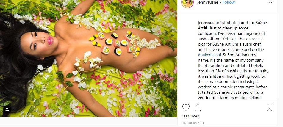 "Нека изясня едно недоразумение. Никога никой не е ял суши от мен. Все още. Това са просто снимки за СуШи Арт. Аз съм суши шеф и имам модели, които идват и правят "голото суши". СуШи Арт не е моето име, това е името на моята компания. Заради традиции и старомодни разбирания по-малко от 2% от суши майсторите са жени. Беше трудно да си намеря работа, защото в тази индустрия доминират мъже. Работила съм в няколко ресторанта преди да стартирам Суши Арт. Започнах като продавач на пазара. Тогава мой приятел ми каза да мисля извън рамките и ми предложи да правя голо суши. Така започна всичко, моята компания прави всичко със суши, но специализира в голото суши. Правила съм много събития на високо ниво, за знаменитости и на червения килим. Това не са ергенски партита. Просто е забавен, секси и изтънчен начин да изживеете живо изкуство и суши", написа Суши.