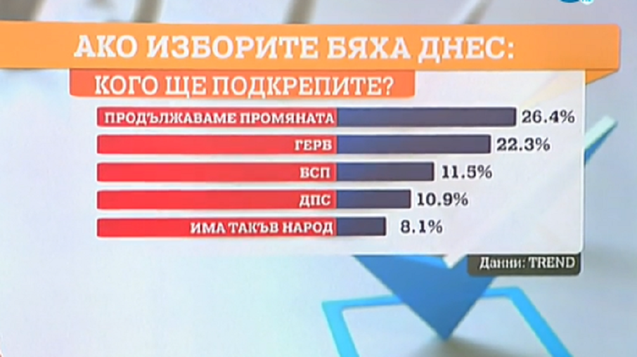 Ако изборите са днес, в парламента ще влязат същите партии, които и са и в момента. "Продължаваме промяната" на Кирчо и Кокорчо запазва първото място според последното социологическо изследване на "Тренд". За формацията на Просто Киро биха гласували 26,4%.