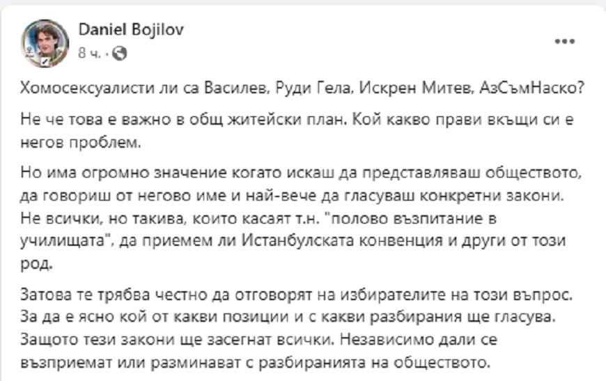 Хомосексуалисти ли са Василев, Руди Гела, Искрен Митев, АзСъмНаско? Този въпрос зададе в профила си във Фейсбук юристът Даниел Божилов.