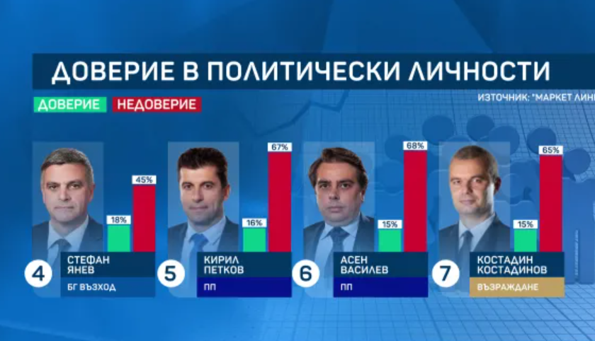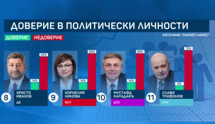 На второ място по одобрение е Гълъб Донев, а след него Бойко Борисов. С най-високо неодобрение са Слави Трифонов, Корнелия Нинова и Мустафа Карадайъ.