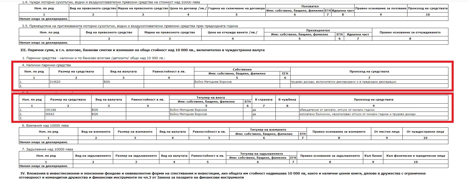Лидерът на ГЕРБ Бойко Борисов е обявил като налични средства само 314 620 лева, като е посочил, че те са от трудови доходи, включително декларирани и в предходни декларации.