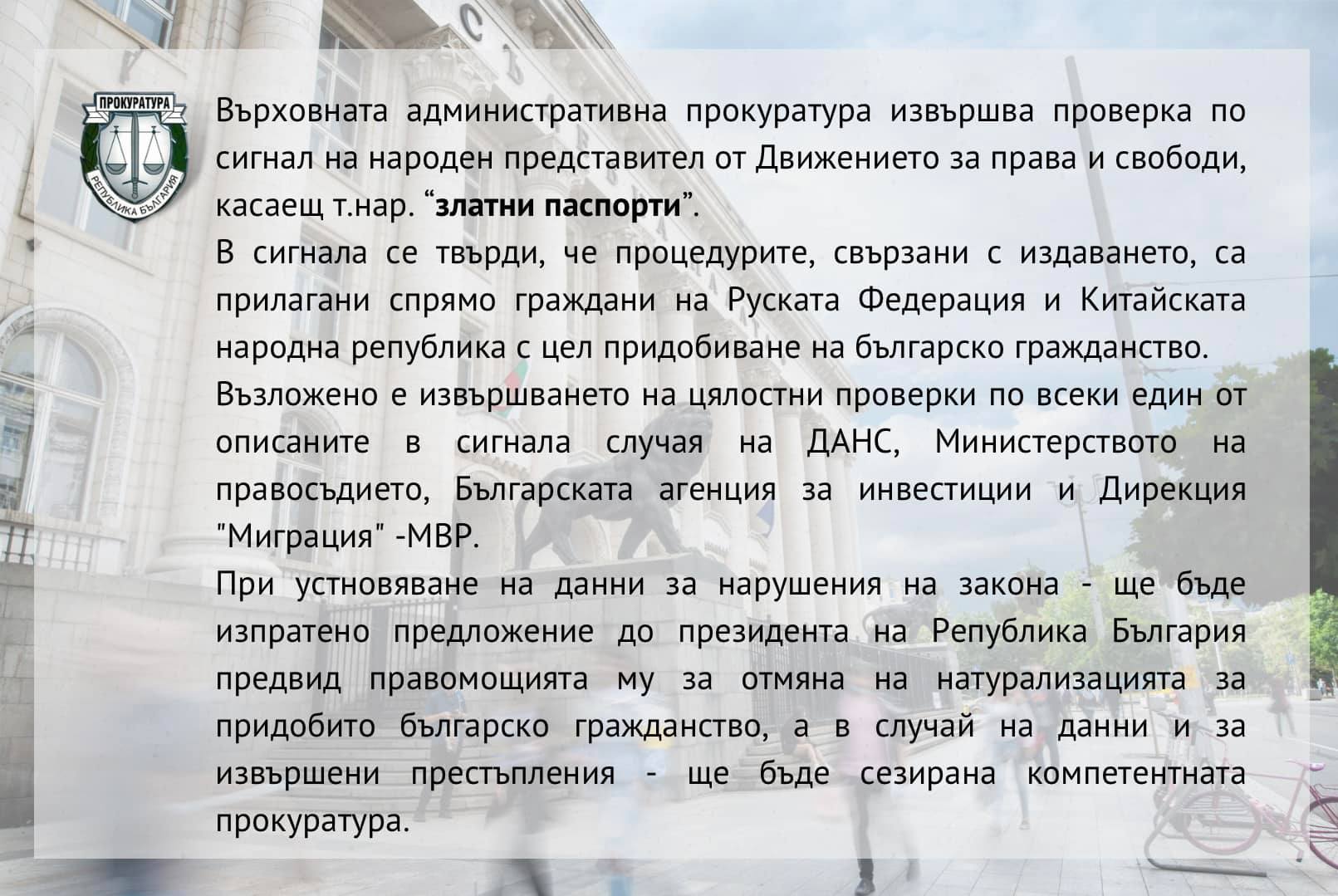 Върховната административна прокуратура извършва проверка по сигнал на народен представител от ДПС, касаещ т.нар. “златни паспорти”.