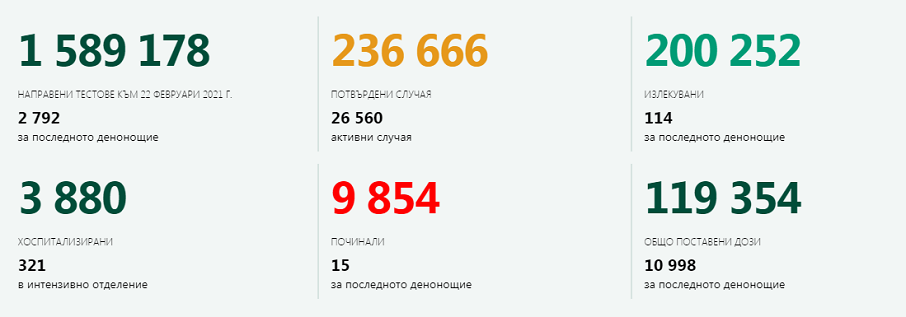 Активните случаи към 21 февруари са 26 560, показват данните в Националната информационна система, видя ПИК.