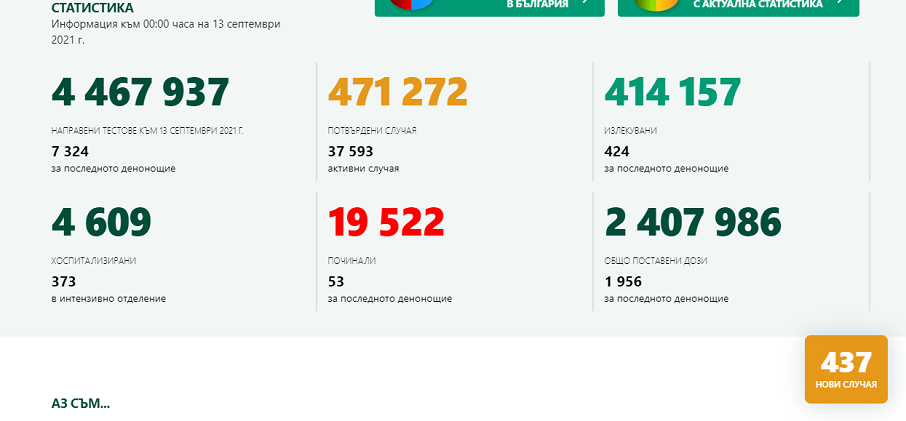 437 са новозаразените с коронавирус у нас за последните 24 часа, видя ПИК в Единния информационен портал. В събота броят на заразените беше 909 души.