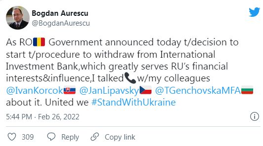 Румънското правителство започва процедура за излизане на страната от Международната инвестиционна банка, която основно обслужва руските финансови интереси и влияние. Това съобщи в своя акаунт в Twitter външният министър на Румъния Богдан Ауреску.