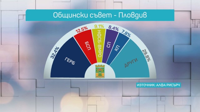 В Пловдив също води листата на ГЕРБ с подкрепа – 32,4%. За БСП съветниците на БСП са гласували 12,5%.